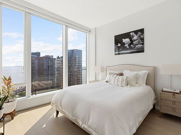 Sun filled and stunning, Residence 27C at the ultra full service 50 West features stunning water views of New York Harbor through oversized floor to ceiling windows.