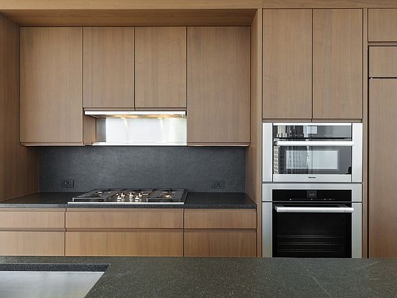 The Great Room on the southern wing features glittering views of Statue of Liberty and New York harbor with an open kitchen layout. The chefs kitchen features custom stained walnut cabinetry, granite countertops and a waterfall island. First-in-class appliances from Miele and Sub-Zero include two wall mounted ovens, gas cooktop, refrigerator, freezer, wine refrigerator, dishwasher and a range hood that vents directly to the outside. The home also has a side by side washer and dryer that is vented outside, as well as a powder room.