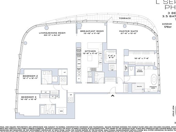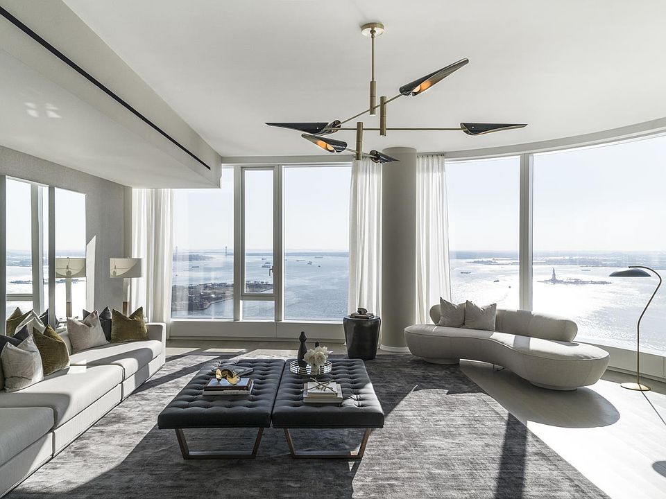Penthouse 61-B, is one of a few PHs atop a striking curved glass tower 50WEST. At 3,434 interior square feet and 176 sf private terrace, this exceptional 3-bedroom, 3,5-bathroom penthouse covers half floor, offering expansive South-facing views of New York Harbor and Statue of Liberty, West view to the Hudson River, and North-facing views of the Manhattan skyline, World Trade Center and beyond. From an elevator vestibule only shared between 2 PHs on this floor, you will enter this majestic home, through a formal entry gallery. Continuing through, the gallery brings you to a breathtaking oversized living room, with nearly 100 linear feet of floor-to-ceiling glass wrapping the gentle curve of the sprawling space, offering panoramic vistas.