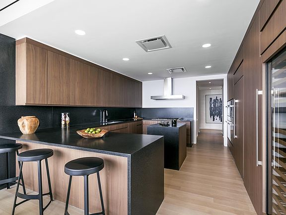 Adjacent to the living room, a formal Breakfast/Dining room flows into the chefs kitchen, which boasts a substantial C-shaped counter tops, a center island allowing for both seamless entertaining and daily living. Meticulously designed by Tomas Jul Hansen, the custom Stevali kitchen features dark stained walnut cabinetry, granite waterfall countertop and backsplash, and top-of-the-line appliances by Miele and Sub-Zero, 6 burner gas cooktop with built-in canopy hood, two ovens, two integrated dishwashers, steam oven, speed oven, refrigerator, freezer and full size wine refrigerator.