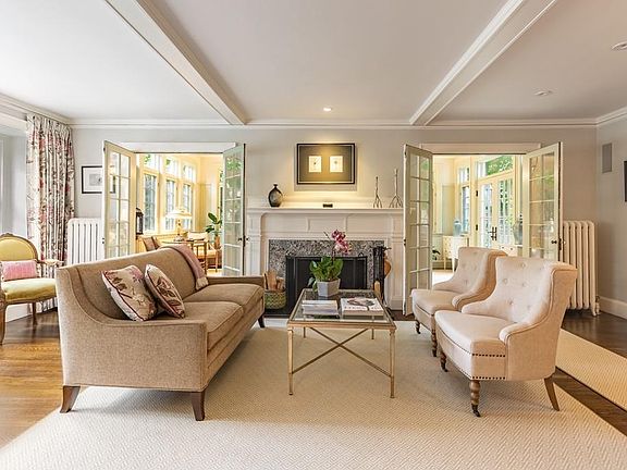 Stately colonial sited in the heart of the Flats. Updated throughout w/modern amenities and custom décor. Welcoming vestibule & foyer, hardwood floors, formal fireplaced living room. Dining room w/wainscoting & walls of windows. Sun room w/high ceilings, stunning windows, radiant heated floors, and French doors leading to a large secluded patio. Cozy library surrounded by built-in shelves. Custom kitchen w/granite counters, custom cabinetry, Viking & Bosch appliances and walk-in pantry. Updated half bath. Second floor offers beautiful master suite, bath, dressing area, and walk-in closet; 2nd ensuite bedroom; and 2 additional bedrooms and full bath. Third floor features carpeted 5th bedroom or office retreat. Lower level has a fireplaced family room, laundry room, and lots of storage. Fenced in backyard offers meandering stone paths to and from the patio area, amidst lovely perennials and ornamental trees. Simply enchanting! Central air, close to schools, downtown & commuter rail.