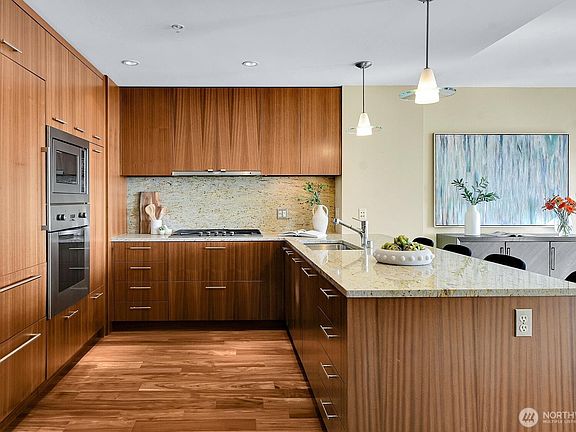 Sleek flat-panel cherry kitchenVistas of mt rainierSoaring windowsGleaming chestnut hardwoodsStunning city viewsSlab countertopsPremium appliances