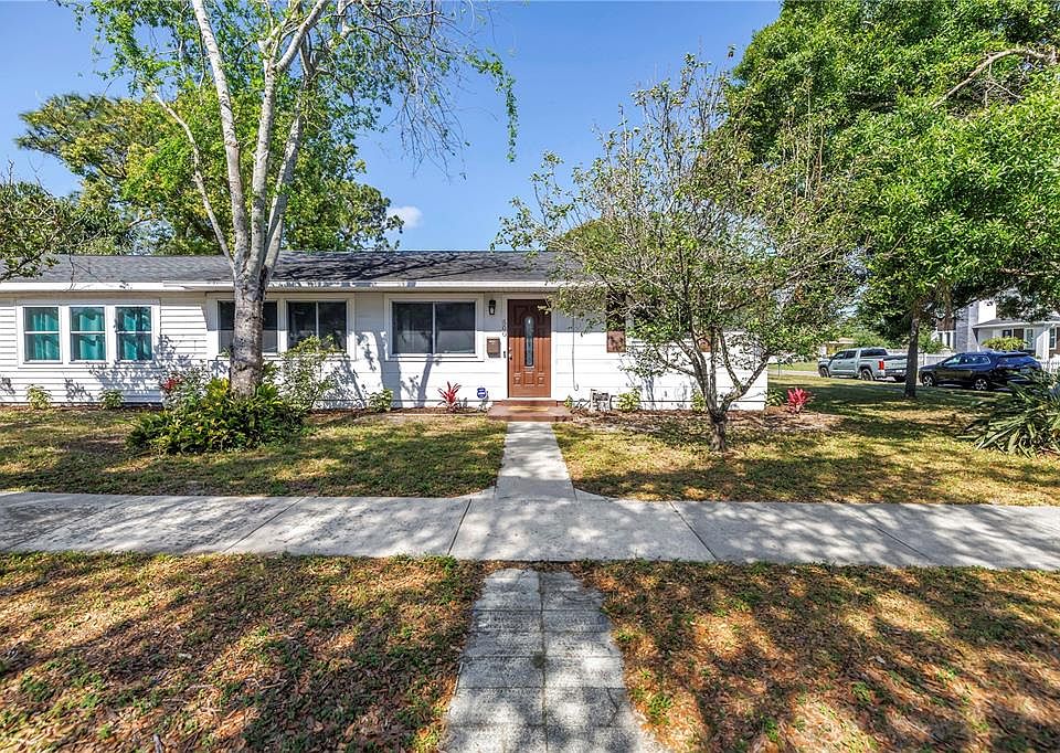 This beautiful three bedroom, two bath split plan home on a corner lot is high and dry in a non-flood zone in Allendale Terrace. Enter into open concept living space with brand new paint and luxury vinyl flooring throughout. The kitchen has been updated with light cabinets, granite countertops, and stainless steel appliances. Two nice sized bedrooms share a hall bath with a tub. An expansive master suite off the living room has tons of natural light, vaulted ceilings, en-suite full bathroom with shower, and multiple closets with plenty of storage. One car garage features a stackable washer and dryer and access to the backyard. More upgrades include tankless hot water heater, new roof in 2016, new windows throughout in 2019, new hvac in 2021, and the home was tented for termites in July 2024 with transferable warranty. Centrally located and close to shopping, gyms, parks, downtown St. Pete, I-275, and all Tampa Bay has to offer, make your appointment to see it today!