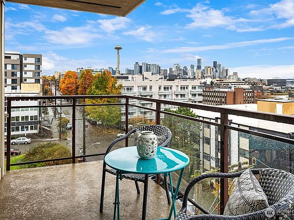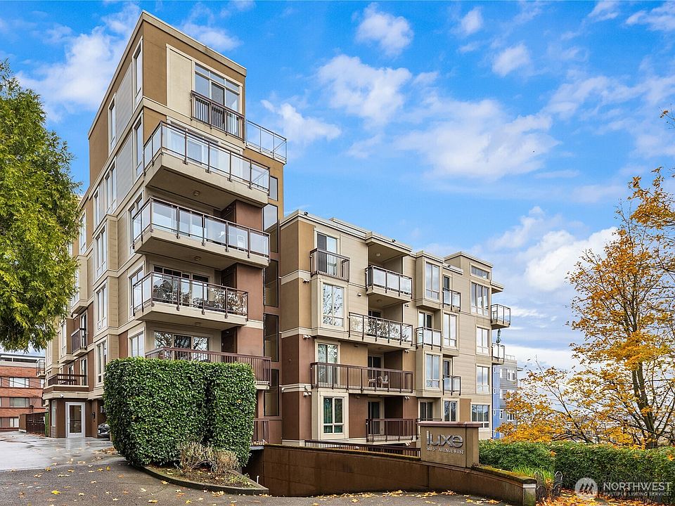 Soaring above the city, this top-floor corner residence at The Luxe captures sweeping panoramas from Mt. Rainier to Elliott Bay and the shimmering Olympic peaks. Sunlight pours through 12-foot ceilings and expansive windows, filling nearly 1,000 sq ft of airy, contemporary living. A generous deck extends your living space outdoors—perfect for morning coffee or evening sunsets. Inside, enjoy a serene primary suite, versatile 2nd bed/office, A/C, in-unit laundry, and abundant storage. Two secure parking spaces and a private storage room add ease to urban life. Fully renewed in 2007, The Luxe blends boutique sophistication with unbeatable access to Seattle Center, SLU, Interbay, downtown, and waterfront. Elevated living in the heart of Uptown!