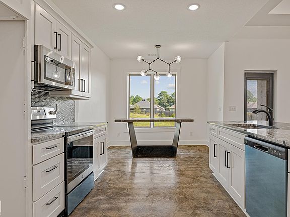 This beautifully designed all-brick home offers modern style, efficiency, and quality craftsmanship on a spacious acre lot. Constructed with insulated concrete for durability and energy savings, the home features granite countertops throughout, stained concrete floors, and sleek modern fixtures that create a polished and contemporary feel. The kitchen is complete with stainless steel appliances and abundant counter space, flowing seamlessly into the open living area accented by an electric fireplace. The primary suite includes a tiled shower and stand-alone soaking tub, offering a spa-like retreat within the home. With an all-electric design, fresh modern finishes, and plenty of outdoor space, this property combines low-maintenance living with everyday comfort.