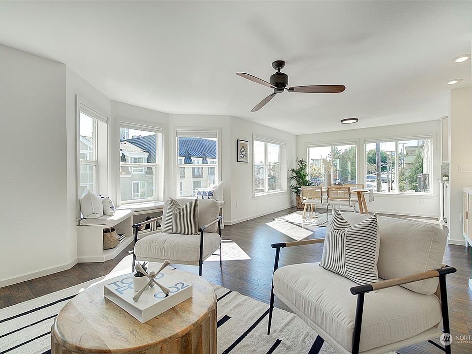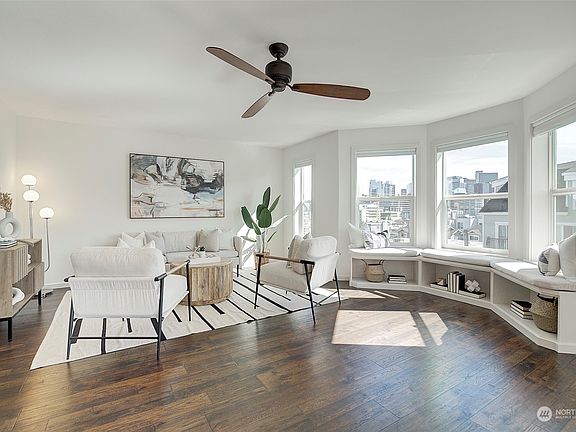 Spectacular, Light and bright corner unit condo with downtown views. Lots of natural light through large, south-facing windows. Two large, spacious bedrooms. Primary has an ensuite bathroom and double closets. Both bathrooms were recently updated. Heated floors throughout the unit (nice!), and new Low-E Glass. Two secured parking spots with bike parking and a storage unit. Located in vibrant Lower Queen Anne just steps from charming cafes and restaurants, grocery stores, Seattle Center, and Lake Union. Close to South Lake Union and Google, Meta, and Amazon offices. Well-funded HOA. Full-size washer and dryer in unit.