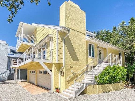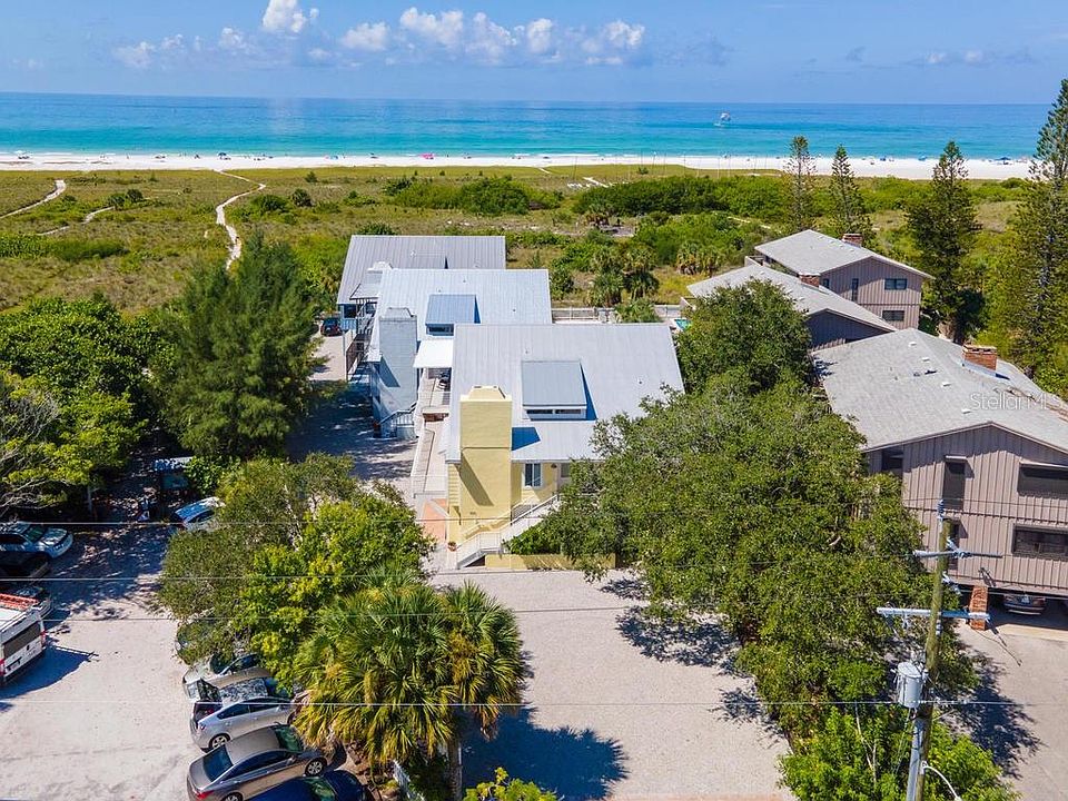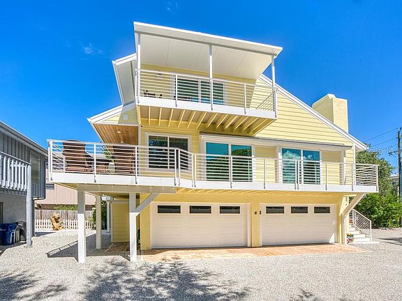 Directly on the white sands of Siesta Beach, this gorgeously updated Key West style beach house grants you the island lifestyle of your dreams. Easy accessibility to Siesta Key village has you within listening distance to local bands and Gulf waves from the luxury of your porch. On the first level, you find an impressive bonus/media room with a wet bar, half bathroom; under-air laundry room with access to the pool, and a generous four-car garage with room for all your beach toys. Tranquility abounds in upstairs living areas. Enjoy the ambiance of a crackling fire in the living room, complemented by soaring ceilings and expansive sliders overlooking the trees. Entertain guests of any occasion in the dining room that is open to the exquisite kitchen featuring a large cooktop island, Thermadore appliances, cabinet pantry, and coffee bar. The family room with sliding glass doors to covered patio and direct beach views affords the splendor of tropical breezes to drift through the home and effortless transition onto the wraparound deck. The third floor boasts the master retreat epitomizing sanctuary with an en-suite bath including dual sinks and shower, and private balcony. The whole family can claim their domains with the second bedroom providing a private bathroom and balcony and third bedroom offering access to the additional guest bath with privacy. This home is exquisitely designed by interior designer Meg Caswell from HGTV where no expenses were spared. All high-quality upgrades including Quarzite natural stone countertops, Ro Sham Beau lighting, custom cabinetry from Campbell's cabinets, backsplash by Ann Sachs, designer fabrics, custom vanities, and high end Kohler fixtures make this the home of your dreams. Impact glass windows and concrete hardy board on the exterior bestow peace of mind to last a lifetime. This gorgeous home combines the advantages of a large unattached home with the convenience of a small three-unit condominium association with rental income potential if you so choose. Whether you make this your primary residence, a vacation home, or investment property, this is a desirable home at an incredible opportunity for its premium Siesta Key location and return on investment. Your paradise dreams are realized on the Gulf of Mexico's Siesta Beach.