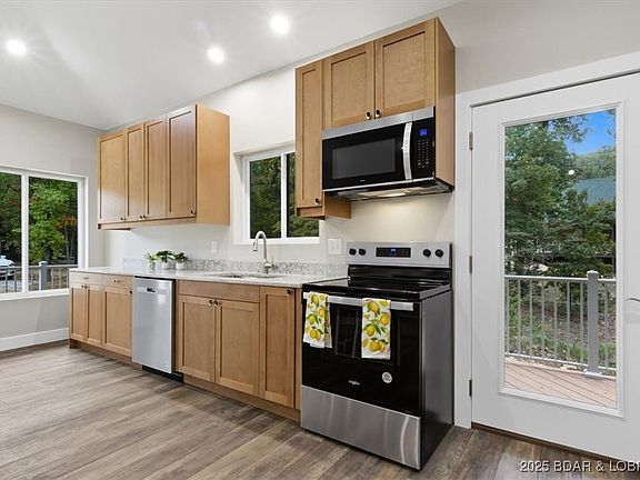 New Construction 4 Bed, 3 Bath on 5 Acres! It's rare that privacy, luxury, and convenience all cross paths but gorgeous new home offers that and so much more! From a wrap around deck to an open concept floor plan this is a must see. The main level features vaulted ceilings, plenty of kitchen counter space, the owner's ensuite and another bedroom and full bath. Downstairs offers a second living room area, two bedrooms, third full bathroom, and laundry. Outdoor entertaining space is of no shortage here! With a huge main level deck and lower level covered patio, there is tons of room for family and friends! Offering plenty of flat parking and a detached 2 car garage that is coming soon! Relax in the surrounding of nature and wildlife--all while being next door to Old Kinderhook Golf, down the road from Ball Parks National, and just 5 minutes from Camdenton square! Enjoy top of the line amenities--brand new clubhouse with heated indoor and outdoor pools, fitness center, day spa, plus pickleball courts, community pond stocked with tons of fish, maintained streets, and more! Furniture, Appliances, Hot Tub, & 2025 Golf Cart INCLUDED!!! (road will be asphalted after construction)