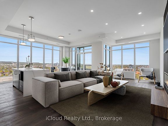 Soaring 20 stories above downtown Burlington -one of Canada's most desirable communities- this stunning Brand-New Corner End-Unit PENTHOUSE takes in all of the sunshine & breathtaking views to the south, east & north. Over 80K in upgrades, this 3-bed, 2-bath home spans 1,510 sf of beautifully designed open-concept living space that seamlessly blends comfort, function & style. Modern finishings & seemingly endless windows equipped w/ luxury automated roller shades in every room. Top-of-the-line vinyl flooring, upgraded cabinetry & closets, undercabinet lighting & pot lights throughout. The living room offers 10-ft ceilings, a custom-made accent wall & an elegant freplace. The kitchen comes with ample cabinetry, a large center island overlooking the living area, SS appliances, granite counters & backsplash. The primary suite displays a custom-made accent wall, modern light fixtures, a walk-in closet, a professionally designed four-piece ensuite with rain shower, glass door, pot lights, luxury tile on floor & walls, & a private secondary balcony w/ city & lake views. The second bedroom also offers outstanding city views, ample storage space, a custom accent wall & upgraded lighting fixtures. The third bedroom doubles as a great private office space or guest room w/ closet. The guest 4-piece bath offers a custom glass door, pot lights, and luxury tile on the floor & walls. Custom laundry roomcabinetry & central air with dual thermostats. Included are 1 titled underground parking stall & 1 oversized storage locker. Classy building entrance w/ 24-hour concierge/security & three elevators. Amenities include a fully equipped gym, rooftop sky deck with BBQ stations, a large event room, social lounge, guest suite, bike storage & visitor parking. Enjoy the best in walkable urban living, w/ shops, restaurants, beach access, & entertainment just steps away. Close to major highways, hospital & top schools. Canada's first Star Energy Efficient Condo.