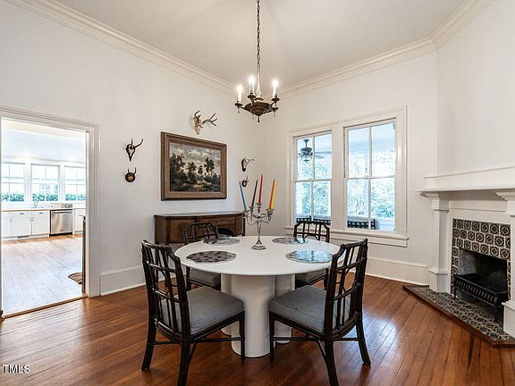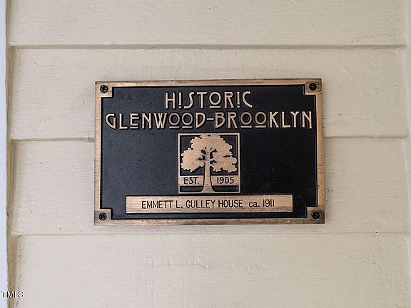 Charming bungalow in Historic Glenwood-Brooklyn with a large covered front porch overlooking the downtown Raleigh skyline - the light-filled center hall design is flanked by gracious formals with corner fireplaces and a study with custom built-ins - the updated kitchen features ''above counter window walls'', stainless steel appliances, vaulted ceiling and breakfast nook with access to the side screened porch - two bedrooms on main level with private baths - upstairs primary retreat with renovated bath, walk-in closet and balcony (11x8) - large, fenced back and side yards with patio (32x15) and detached storage (20x12) - partial basement with laundry + mechanical room - home features impressive dimensions with unique architectural detail that is further enhanced by the 11' ceilings, 4 fireplaces and oak/heart pine floors - plantation shutters - solid brass hardware - excellent schools - walk to Fred Fletcher Park and Glenwood South - quiet tree-lined dead-end street with sidewalks - indescribable!
