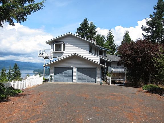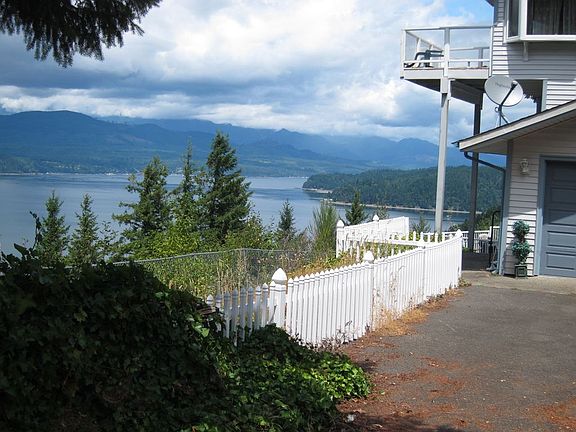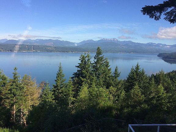 What a spot! What a view! Panoramic views of Olympic mtns,Hood Canal,Skok river&valley beyond. End of the road privacy w/gated entry&fully fenced yard.New roof.2 hot water tanks, energy efficient Russian fireplaces on 2 floors.2nd kitchen,floor to ceiling windows,3 decks incl the expansive deck w/ built-in firepit on main floor. Covered outdoor hot tub,disabled access,large 2-car garage.Close to golf course, marina & parks.Solid-built house in need of some updating.A rare jewel waiting to shine..