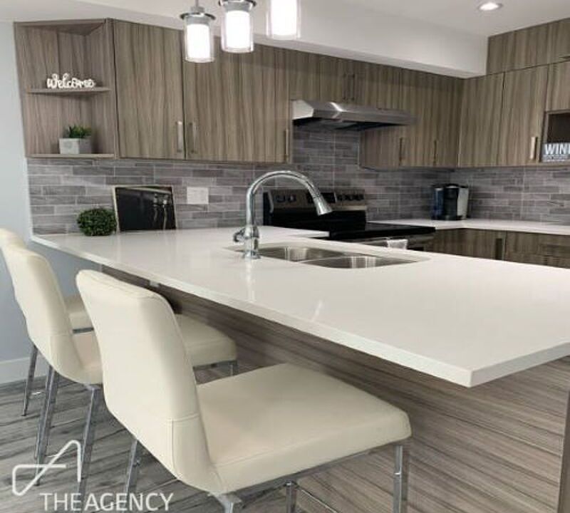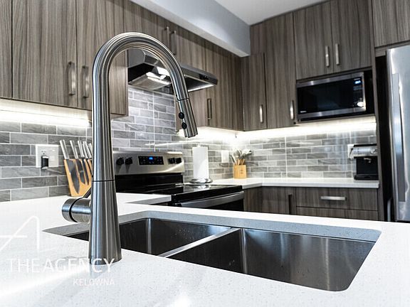 Quartz stone countertopsSleek european-style cabinetryMosaic stone backsplashesStainless-steel appliancesTandem garagePrivate fenced yardsOpen concept kitchen