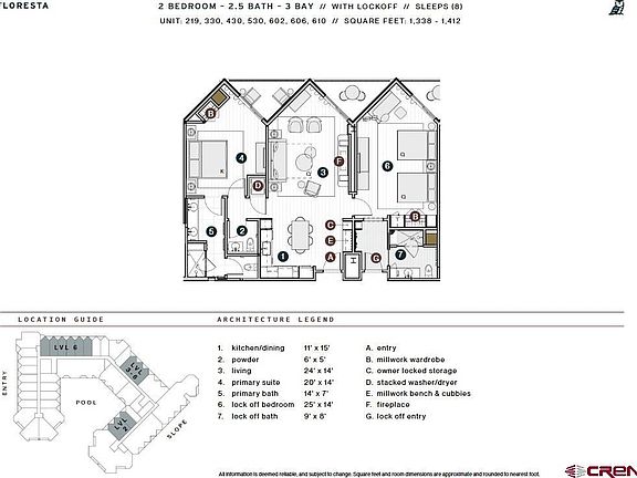 Perched on the top floor, Beckwith Residence 602 is a premier residence within The Beckwith’s exclusive ski-in, ski-out collection of to-be-built 49 residences. With an exterior northeast-facing orientation, this 1,412-square-foot Floresta floor plan offers an elevated perspective capturing a wide panorama of sky, trail, and alpine beauty. Views to the north and northeast include a dramatic wedge view of White Rock Mountain, as well as a sweeping overlook of the primary walking path to the lifts and the Columbine ski trail, bringing you closer to the heart of the action— without sacrificing serenity. This thoughtfully designed residence features two bedrooms, including a spacious primary suite, a private lockoff, and an open-concept kitchen, living, and dining area that seamlessly blends indoor comfort with outdoor connection. Inside, discover mountain-modern interiors bathed in soft earthy neutrals, warm wood tones, and natural textures that echo the surrounding alpine meadows. Whimsical design details and unexpected pops of color bring a distinctive sense of place and playful sophistication. The gourmet kitchen is outfitted with natural stone countertops, high-end appliances, and generous space for culinary exploration and entertaining. A custom millwork bench and cubbies at the entry make gear organization effortless. The living area features wide-plank wood flooring, a sleek electric fireplace, and easy flow to the balcony for seamless indoor-outdoor living. The primary suite is a private sanctuary with a millwork wardrobe, separate balcony, and a spa-inspired en-suite bath featuring Kohler fixtures, and luxurious finishes. The lockoff suite provides yet another peaceful escape, with mountain-inspired textures, en-suite bath, and elevated privacy— ideal for hosting friends or family. Additional conveniences include a stylish powder room with bespoke wall coverings, in-unit laundry with stacked washer/dryer, and secure owner’s gear storage. From the views of skiers on Columbine ski trail to the breathtaking alpenglow on White Rock Mountain, Residence 602 is your elevated basecamp— perfectly positioned for four-season adventure and the everyday magic of life in Crested Butte. The Beckwith is the only ski-in, ski-out resort in the heart of Crested Butte's base area, with world-class amenities including a four-star, community-inspired hotel, seamless ski valet, luxurious spa, adventure concierge, and private mountain & social community, Club Beck. A multi-phased reimaging of Elevation Hotel & Spa will transform almost every space at the resort, with residences anticipated for completion in the Winter 26-27 ski season.