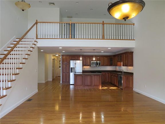 Spacious open floor plan townhome with soaring ceilings. Gorgeous granite center isle kitchen with stainless appliances. Extensive hardwoods, central air, alarm, fireplace, and huge basement. Large bedroom and full bath on each floor. Versatile loft space could be den, office, or guest area. Main level laundry room, Private rear deck. A tremendous value!