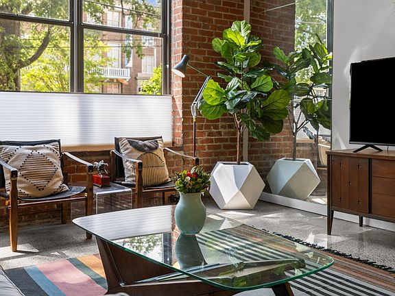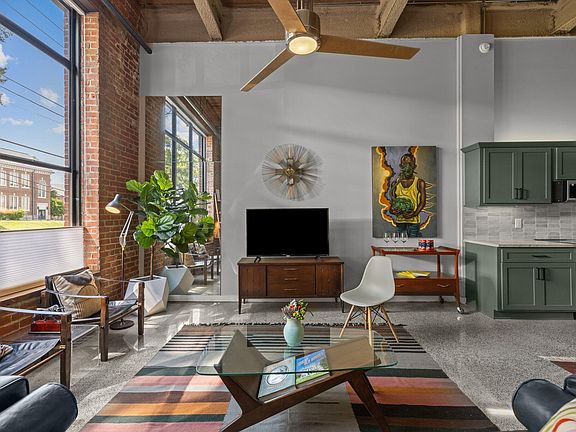 Experience the daily dopamine of mid-century deck house living, in the package of an exceedingly convenient downtown condo. Dramatic 14 ft ceilings and oversized 10 ft tall windows frame your view of the Durham School of The Arts across the street. The dine-in kitchen, under the glow of the iconic George Nelson saucer bubble pendant, features natural quartzite countertops + all new Samsung appliances, including a future proof induction stove. Also new: the roof was replaced in 2023 and HVAC in 2024.    Polished concrete floors (brilliantly restored by Luxcrete) and exposed brick reveal the history of Bullington Warehouse, erected in 1927 for storing and drying tobacco.      Now, the building sits at the forefront of Durham's newer prevalent industry of tech, just two blocks away from Google and the Innovation District. The building is on Durham's upcoming Rail Trail which will make a jaunt downtown even easier with 2026 projected completion. For investors, the building features no rental cap and only a 30 day minimum lease.    Live at the crossroads of Durham's old and new industries, in a thoughtfully curated condo that celebrates the historic while embracing the spirit of innovation.    Disclaimer: The seller is a licensed real estate agent.