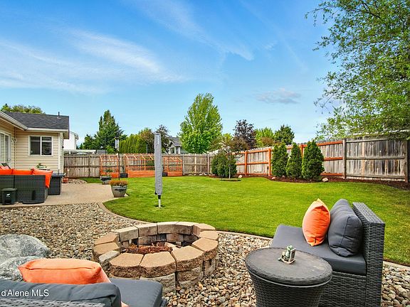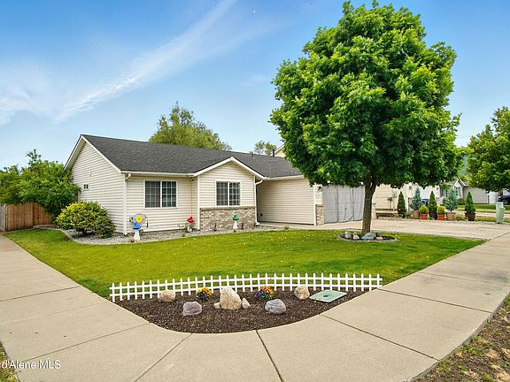 This well-maintained home sits on a spacious corner lot and has been thoughtfully updated throughout—featuring a brand-new roof (2024), freshly painted interior and cabinets, updated light fixtures, and a new fridge and washer/dryer set. Enjoy a spacious living room and a smart split-bedroom layout that offers privacy, with the primary suite on one side and two additional bedrooms and a full bath on the other. The backyard is a true highlight with beautifully kept landscaping, raised planter boxes, a cozy fire pit, and extra parking with gravel space and pull-through access to the yard. Located with easy access to I-90, this home is perfectly positioned between Coeur d'Alene and Spokane—ideal for commuting or enjoying the best of both cities. Move-in ready and packed with charm!