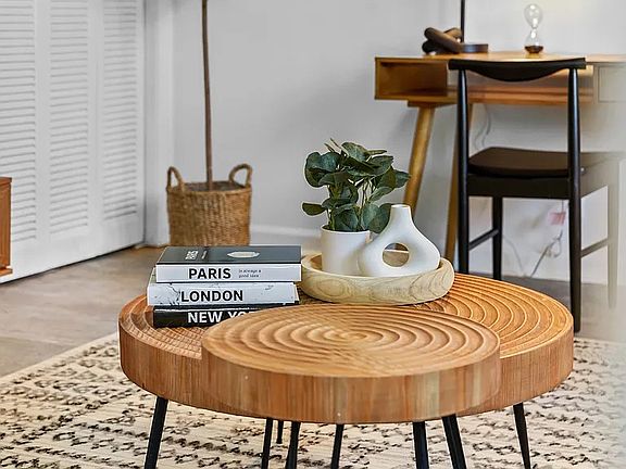 Kitchen comes stocked with pots, pans, measuring utensils, serving ware, bake ware, along with a toaster and keurig. Living room is set up with a smart TV and a desk. A smart TV is also included in the master bedroom. The bedrooms have very large closets; the master bedroom has a large walk in closet. Beds are fully set up with extra pillows and linens.