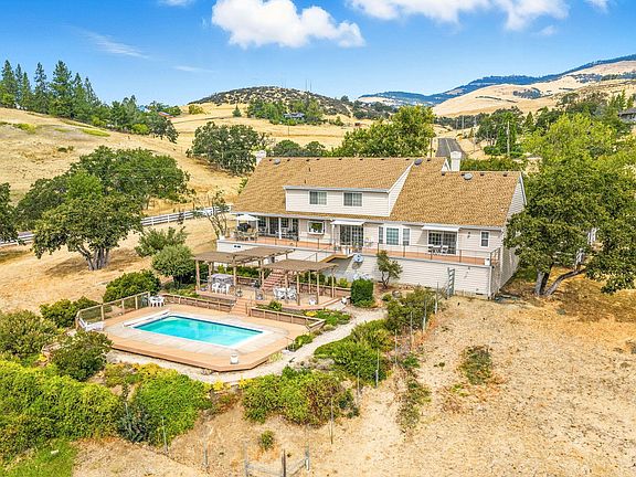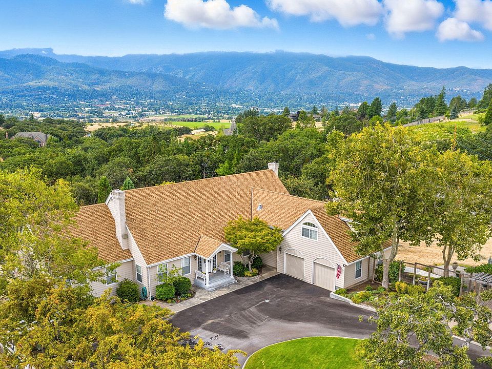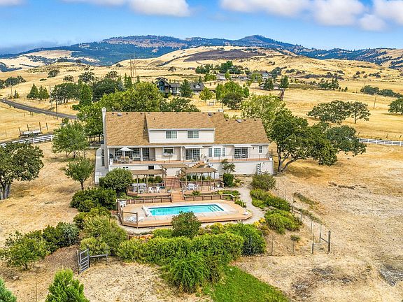 Incredibly desirable Ashland setting—private, quiet & close to town yet distinctly rural. On 5.09 acres with panoramic views of Mt. Ashland & the city, this 3566 sq ft 1985 home offers 5 bedrooms, 4.5 baths & two full primary suites, including a main-level retreat. The main floor features two sitting rooms with wood-burning fireplaces, a living room bar & a 2019 kitchen remodel with quartz leather-finish counters & painted cabinetry. Upstairs features two bedrooms with walk-in closets, a large bath & separate HVAC, plus a guest suite with a loft & window seat. Outdoor amenities: pool with Trex decking, gazebo, apple & plum trees, Gearky Creek, Talent Irrigation water & two workshops (50'x50' & 42'x36'). Other highlights: 2-car garage with workbench, wine cellar, auto generators, water softener, security system & abundant storage. Updates: roof, exterior paint, trellis, decking, railings, pool/spa (2018); HVAC (2019); blinds (2019); electrical/lighting (2018).