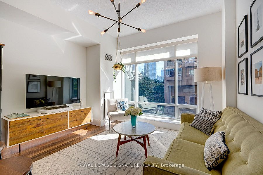 Sophisticated waterfront living in one of the best Toronto addresses - 500 Queens Quay! This spacious one-bedroom one-bathroom condo features a thoughtfully designed layout with anoversized primary bedroom, complete with a massive closet outfitted with custom organizers. The renovated bathroom and open-concept kitchen/living area elevate everyday living, with full-size stainless steel appliances, ample counter space, and a bright, well-proportioned living room ideal for both relaxation and entertaining. Enjoy the comfort and convenience of one parking spot plus a large storage locker conveniently located on the same floor. All this in a highly sought-after building, steps from the lake and overlooking the tranquil Toronto Music Garden. Lastly, this condo has easy access to transit, the financial district, island airport, dining and Toronto's vibrant waterfront.Suite 208E Is the perfect condo for those seeking sophisticated city living with a serene lakeside backdrop.