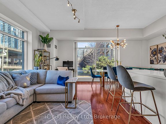 Welcome to this beautifully updated 2-bedroom + den suite in Torontos vibrant Harbourfront community, offering 1,350 sq. ft. of intelligently designed space, where the pulse of the city meets the serenity of the lake. Rarely does a residence like this come to market where the space and feel of a small home meet the ease and amenities of condo living in one of the most sought-after downtown locations. Ideal for professionals, downsizers, or small families seeking comfort without compromising location or lifestyle. Floor-to-ceiling windows flood the semi open-concept living and dining areas with natural light and offer charming views of the lake and CN Tower peeking through the cityscape - a quiet reminder that you're just steps from the waterfront. The renovated kitchen is a standout feature, with sleek stone countertops, stainless steel appliances, and thoughtful modern finishes that blend style and functionality. Both bedrooms are generously sized, featuring large closets, oversized windows, electronic blinds, and blackout shades - perfect for restful nights and peaceful mornings. The primary suite includes a newly renovated ensuite bath for added comfort and privacy. A spacious den with a closet offers flexible use as a third bedroom, home office, or creative studio, ideal for professionals, downsizers, or growing families. Step outside your door for lakeside strolls or head just minutes away to Scotiabank Arena, Rogers Centre, and Torontos top restaurants and cultural destinations. Enjoy the perfect balance of urban energy and lakeside calm, all in one exceptional location. Included with this home are one parking space, one storage locker, and full access to premium, resort-style amenities: 24-hour concierge and security, visitor parking, sauna, fitness centre, library, and more. Amenities are being updated. EV charging is also available in the garage. This is a non-smoking building. Don't miss your opportunity to experience waterfront living at its finest.