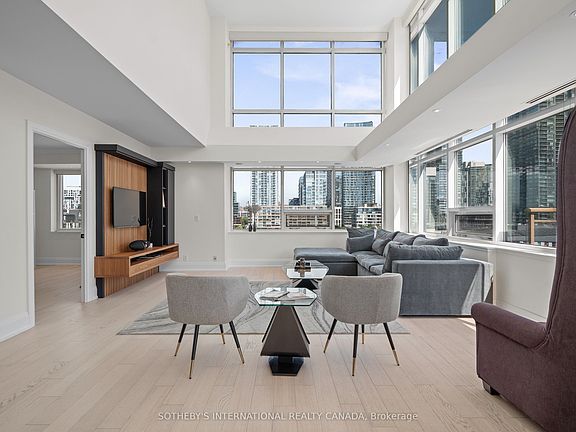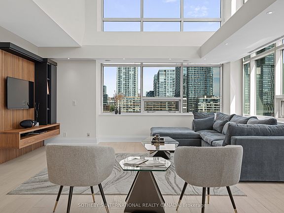 Welcome to this luxurious Fully Furnished Two-level Penthouse Corner Suite, An Exceptional 3-bedrooms, 3.5-bathroom Residence and one of the True Jewels of Queens Quay. With soaring 18-foot ceilings in the living room, dramatic floor-to-ceiling windows, and southern and eastern exposures, this home offers breathtaking views of both Lake Ontario and the Toronto skyline. The open-concept design is enhanced by a gas fireplace, built-in speakers, and an abundance of natural light, creating a warm yet sophisticated atmosphere.The gourmet kitchen features a stainless steel gas stove, fridge, dishwasher, and premium finishes, while spa-inspired bathrooms include airflow whirlpool tubs for ultimate relaxation. Each of the three spacious bedrooms boasts its own ensuite bathroom, with the private primary suite enjoying panoramic water and city vistas. For convenience, the suite is equipped with a washer/dryer and comes fully furnished for immediate enjoyment.Additional highlights include two premium parking spots, generous living and entertaining spaces, and a seamless blend of modern luxury with everyday comfort. Ideally located, this residence places you just steps from the Scotiabank arena , Rogers Centre, Union Station, public transit, world-class restaurants, boutique shopping, and Starbucks right at your door. Offering the perfect balance of elegance, comfort, and lifestyle, this penthouse represents a rare opportunity to live in one of Torontos most sought-after waterfront addresses.