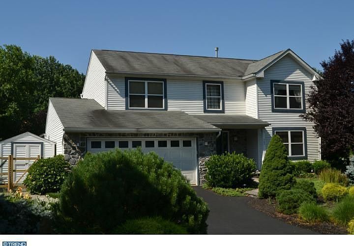 Beautiful Fox Chase Farm - Betz Built home with sq ft of the 4 bedroom homes in community redesigned for larger room sizes and main bedroom has 2 walk-in closets, shoe closet in dressing room; three linen closets Paver front walkway and entrance; enter into 2-story foyer with fabulous hard wood floors that go into great room and kitchen; great room has wonderful stone f/p, surround sound wiring and outside exit to paver rear covered patio with ceiling fan, fenced-in yard and hot tub; magnificent landscaping with wonderful plantings,8 zone sprinkler system, shed with ramp had shelving and tool hooks; phone line installed in powder room; great home with all the modern amenities
