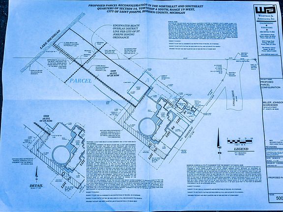 Parcel B on Survey. First time for sale. Newly created .991 acre parcel with 99.87' of littoral Lake Michigan frontage on St. Joseph's Gold Coast not within the critical dune high risk erosion area. Great Views of the north and south piers. Very easy access to a sandy beach with no high bluff. A premier building spot in a very convenient location close to the West Basin, St. Joseph River, Yacht Club & Harbor Shores Golf Course. Note the existing home at 500 Ridgeway has a 5' wide beach access easement centered on the property line (with 500 A) to a 12' wide beach use easement centered on the property line at the Lake. Easement is owned by 500 A & 500 B. Tax information is based on current information available & is prior to lot split from the parent parcel completed by county. The new tax