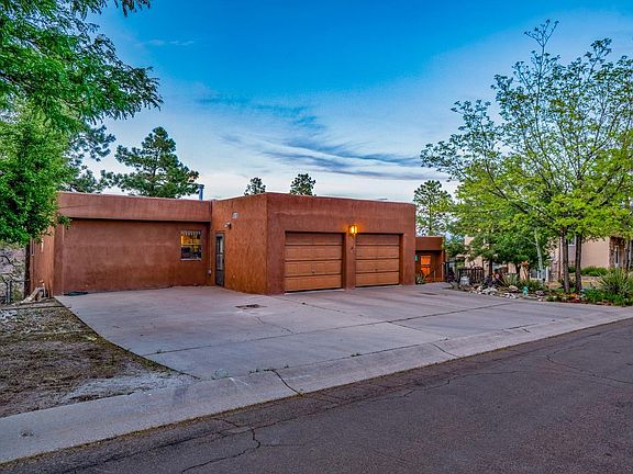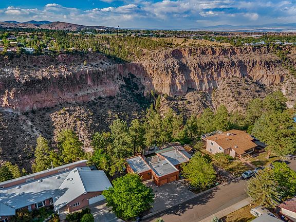 Rim Road Canyon Lot, Downtown Los Alamos, RV Ready, Hot Tub, Tiki Bar, Landscaping, Garage, and More! This three-bedroom home is located on the canyon on Rim Road, close to downtown Los Alamos for convenient access to restaurants, brew pubs, and shopping. Enjoy stunning canyon views from the backyard tiki bar, hot tub, and covered patio, all of which provide great outdoor entertaining opportunities. The house features a split-level floor plan, with the living room, dining room, and kitchen on the main floor. The living room features a large wood stove and walk-out access to the patio and a sunroom (not included in the square footage) that provides passive heating during the winter as well as potential office or gym space. The large kitchen features a center island, maple cabinets, and a built-in wine rack. The primary suite is upstairs, and features a 12 ft x 20 ft master bedroom with canyon views, two walk-in closets, and a full, en suite bathroom. Two guest bedrooms and an updated guest bathroom are on the lower level. The property also includes a two-car garage and is RV-ready, with an RV pad with a 30-amp hookup and RV clean-out drain. This is a great property for enjoying the views and entertaining friends and family. The sellers plan to review offers on Wednesday, June 15, so schedule your showing today!