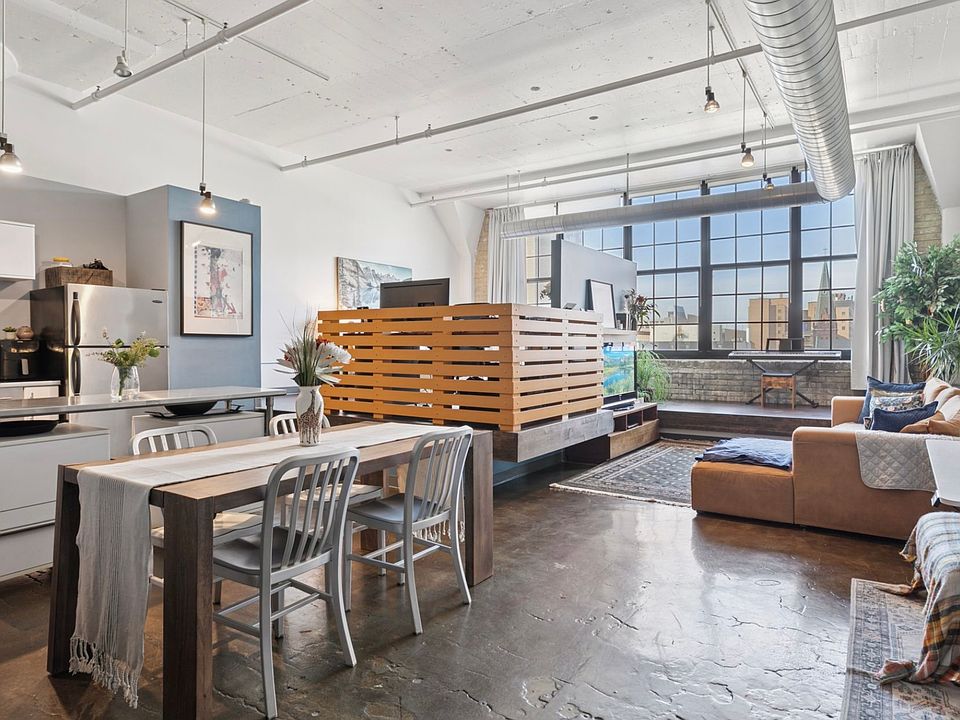 Modern designSkyline viewsIndustrial-style condoDramatic southwest-facing windowsExposed brickNatural lightFlexible open layout