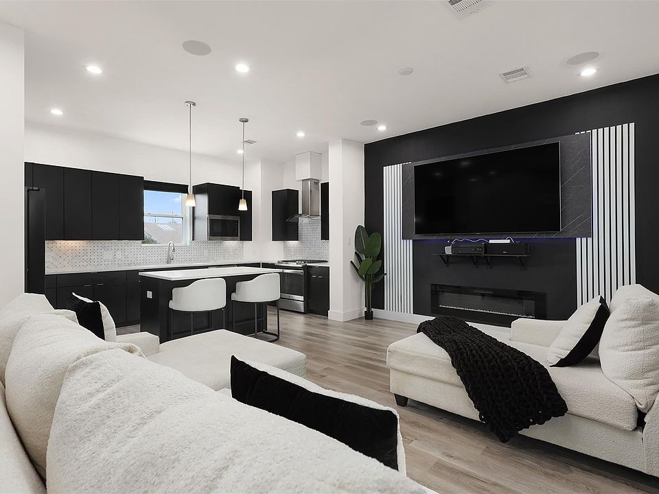 Discover this stunning four-story home perfectly positioned in East Downtown Houston- one of the city's fastest-growing and most vibrant neighborhoods. Offering a blend of modern design and city convenience, this home features open-concept living, high ceilings, and ample natural light on every level. Enjoy panoramic skyline views from the private rooftop terrace-perfect for relaxing or hosting friends. Located within minutes from Downton, the medical center and major highways, you will have quick access to top dining, nightlife, and entertainment options. Refrigerator, washer, dryer, and an 85" television with surround sound system in ceiling are included in rental. Don't miss out on this stunning home-call today for your private tour!
