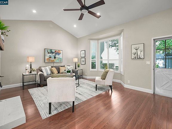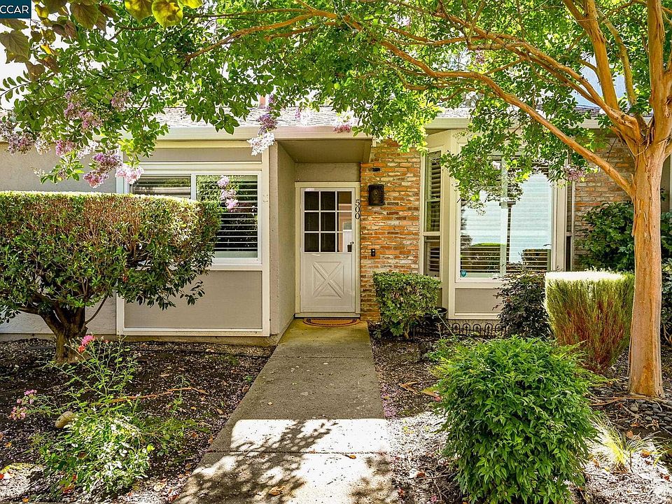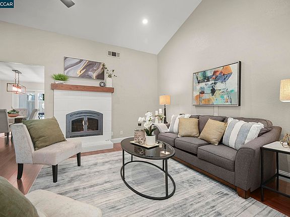 Beautiful single-story 3-bed, 2-bath townhouse with 1,390 sq ft of comfortable living. The kitchen features stainless steel KitchenAid appliances, new dishwasher, granite counters, tile flooring, shiplap half wall, and upgraded lighting. Bathrooms have granite vanities and upgraded vent fans. Primary suite includes a sliding glass door. Nest thermostat and security cameras included. Further updates include: newer flooring (laminate), Shaw carpets, recessed lighting, plantation shutters, ceiling fans, fresh interior texture/paint, and an upgraded electrical panel. Enjoy a private backyard with pavers and water fountain, central AC, a 2-car garage, plus 2 additional parking spaces next to the garage. Located at the back of the complex with direct Iron Horse Trail access. Community amenities include a clubhouse, tennis courts, and pool. Close to Baldwin Elementary, Rose Garden shopping, dining, and downtown Danville.