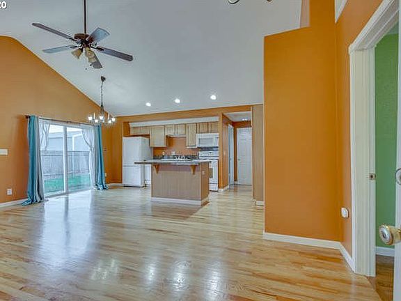Fantastic one level farm home, 3 bed/1 bath on a larger fenced lot w/an attached oversized garage &/or workshop. Great room style w/high vaulted ceilings, an entertaining kitchen w/island & sliding glass doors opening to the backyard. Hardwood flooring throughout home - new wood flooring in all bedrooms. Master bedroom offers a massive walk-in closet w/shelving. Play structure & garage shelving, included. Raised beds for gardening/area for dog run fully fenced.