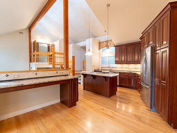 This architect-designed split-level home features 4 bedrooms and 3 full bathrooms, set on a private lot that backs up to a lush nature preserve. Expansive windows throughout the home provide abundant natural light and serene views. The open-concept kitchen includes 40-inch cherry cabinets, granite countertops, a tile backsplash, an island, eat-in area, and breakfast bar, offering both ample storage and excellent space for entertaining. The kitchen opens to a deck, creating seamless indoor-outdoor living. The great room boasts soaring ceilings and skylights, creating a bright and welcoming atmosphere. The large primary suite includes a huge walk-in closet and an updated en suite bathroom. Two additional bedrooms share a full bath, and a private guest suite includes its own bathroom and deck access. The lower level features dual sliding glass doors that lead to an oversized backyard deck overlooking the wooded preserve, perfect for entertaining or relaxing. Located just minutes from the Metra, Fox River, and outdoor recreation. This home is also in a highly rated school district and offers a rare blend of privacy, space, and architectural charm.
