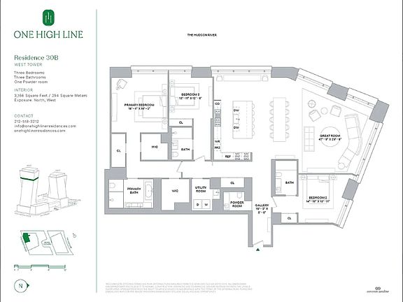 Residence 30B is a stunning 3-bedroom, 3.5-bathroom home spanning 3,166 square feet in the sought-after west tower of One High Line. With sweeping northern and western exposures, this corner residence captures breathtaking views of the Hudson River and city skyline, framed by floor-to-ceiling windows throughout.