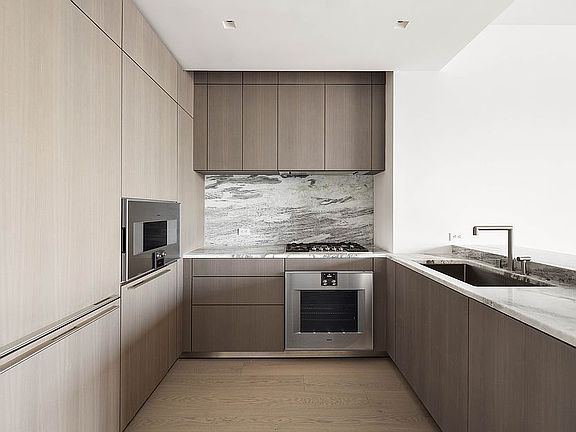 This refined residence features a thoughtfully proportioned living area that offers a graceful separation between formal entertaining and dining. Awash in natural light, the expansive living space flows effortlessly into a sleek, open-concept kitchen curated for both beauty and functionality. Custom Grey Larch cabinetry by Bulthaup pairs seamlessly with elegant White Princess Quartzite countertops and backsplash, all meticulously designed by Gabellini Sheppard. A premium Gaggenau appliance suite and sculptural stainless-steel fixtures by CEA Design complete this sophisticated, modern environment—where timeless design meets everyday comfort.
