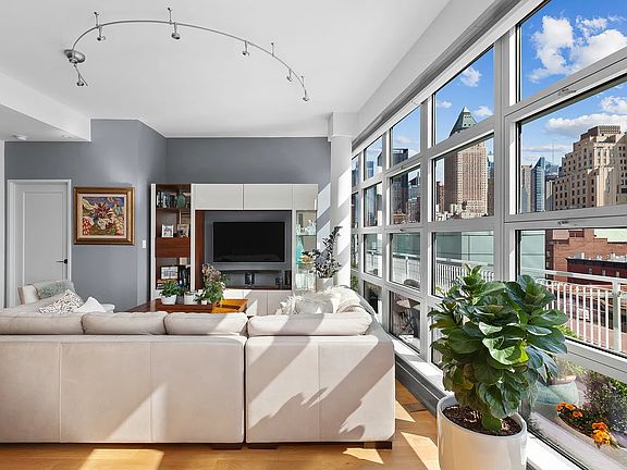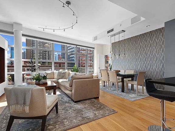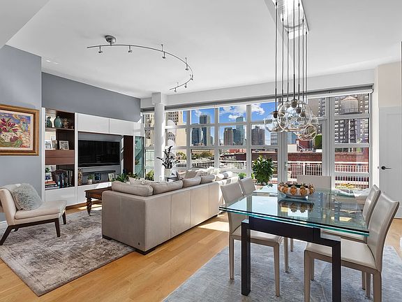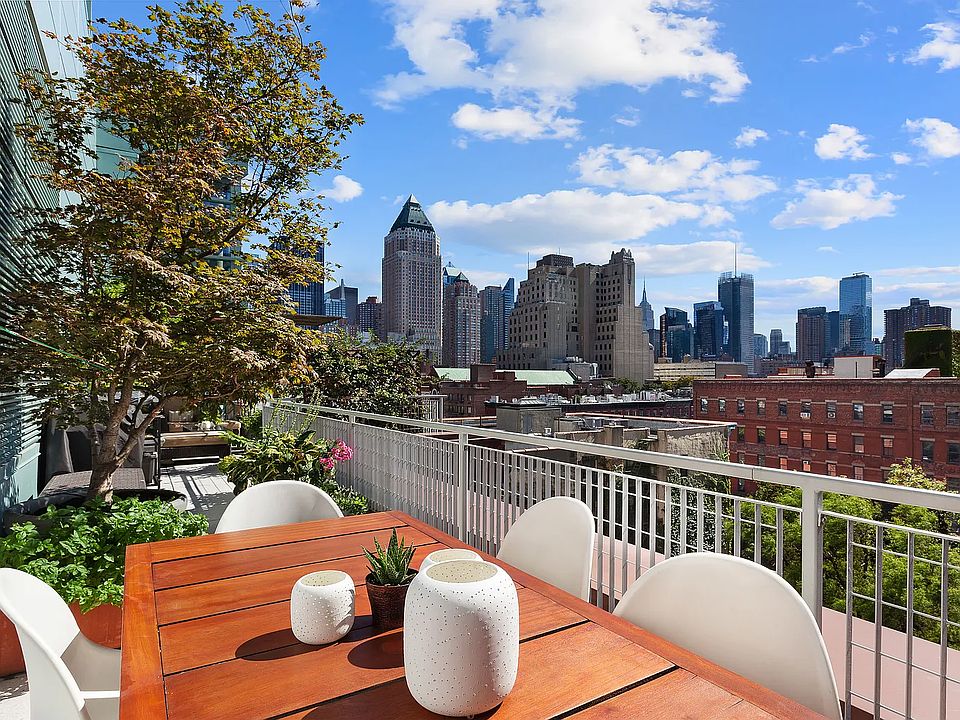 Upon entry to this immaculate residence with soaring 10' ceilings, one is immediately drawn to the radiant southern light pouring in through floor-to-ceiling windows framing views of the lush terrace and some of Manhattan's most notable landmarks including the Freedom Tower and the Citicorp, New York Times, and World Financial Buildings. The unique setback positioning of the building allows for remarkable openness and a pin-drop quiet serenity.