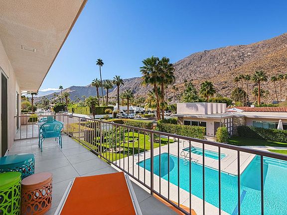 Mid-century design and modern comfort come together beautifully in this two-story condo, created by celebrated architect Herbert Burns. Set in the sought-after Historic Tennis Club neighborhood, the home is just moments from downtown Palm Springs with its lively restaurants, shops, galleries, and nearby hiking trails.Inside, the open-concept layout is ideal for entertaining, with the updated kitchen connecting easily to the dining and living areas. A striking glass-sided staircase leads upstairs to two en-suite bedrooms. The primary suite includes a balcony framing dramatic San Jacinto mountain views, while the guest suite offers European-inspired charm with its rooftop outlooks.Outdoors, a private patio looks onto the sparkling pool and spa, creating the perfect setting to relax or gather with friends. Additional highlights include off-street parking, in-unit laundry, and a complete renovation throughout. Move right in and enjoy Palm Springs living at its finest.
