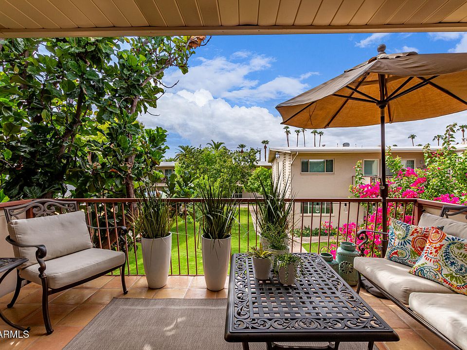 Wonderful Mid Century Co-Op gated community in Central Phoenix. Enter into a plush, well groomed community that is not only charming, but close to all amenities. Walking paths throughout surrounded by lush vegetation including a community garden, fruit trees. Heated pool, community center and other gathering areas. This 1 bedroom 1 bath condo is move in ready - perfect for someone who values connection and community living or the perfect lock and leave. All furnishings can be negotiated. Updates include newer windows, A/C unit, updated bathroom, ceilings and floors. Wonderful patio to relax and have your morning coffee or a glass of wine. Unit is light and bright. Assigned parking and large storage unit in the rear of the property. Indoor cats are allowed. Located in the heart of Phoenix with easy access to the Light Rail and other public transportation. Walking distance to the iconic Clarendon Hotel with its popular bars and restaurants. Located near Phoenix Art Museum, renowned Heard Museum, Melrose Shopping District, Chase Ball Park, Phoenix Suns Arena, art galleries and a large library. Hurry this one will go fast!