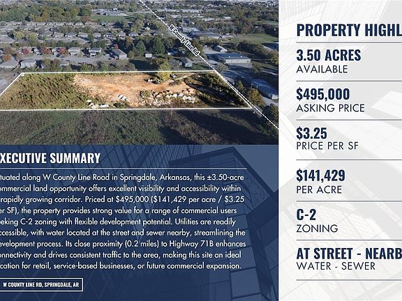 Situated along W County Line Road in Springdale, Arkansas, this ±3.50-acre commercial land opportunity offers excellent visibility and accessibility within a rapidly growing corridor. Priced at $495,000 ($141,429 per acre / $3.25 per SF), the property provides strong value for a range of commercial users seeking C-2 zoning with flexible development potential. Utilities are readily