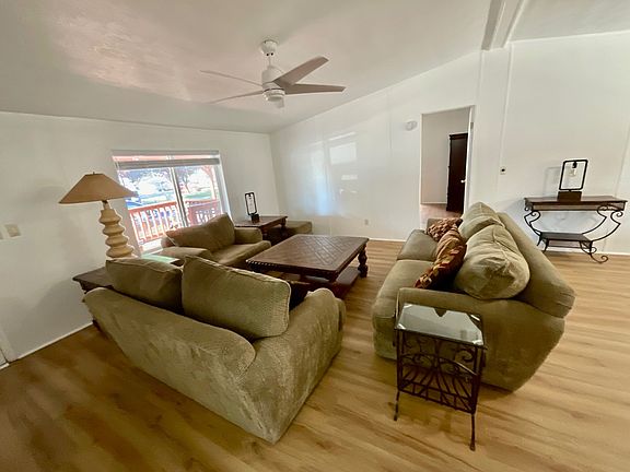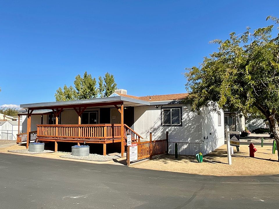 Welcome to this beautifully maintained 3-bedroom, 2-bath manufactured home, perfectly situated on a large corner lot. With thoughtful upgrades and inviting spaces throughout, this home is move in ready. Step inside to find vaulted ceilings, fresh interior paint, and newer laminate flooring that flows through the main living areas. The heart of the home features a bright and functional kitchen complete with a cozy dining nook and a functional pantry. A bonus room and separate hobby room provide flexible space-perfect for a home office, crafting, or extra storage. The primary suite is spacious and private, complete with rich laminate wood flooring, a ceiling fan, and an attached bathroom featuring a garden tub beneath a skylight, letting in soft natural light for a spa like retreat. The additional bedrooms are nicely sized, and the home's layout provides comfort and separation for privacy. Outside, enjoy a fenced, hardscaped, yard that's low-maintenance and ideal for relaxing or entertaining. A covered deck and patio offer shade and privacy, while a ramp leading to the deck adds accessibility. You'll also appreciate the long carport, two storage sheds, and the overall generous outdoor space. Located in a welcoming community, this home is truly move in ready and waiting for you to make it your own. This park is in the heart of town and has great access to shopping, restaurants, and convenience stores.