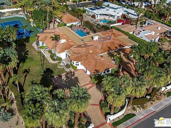 A rare offering in the heart of the desert, this private, gated tennis estate spans 1.15 acres of resort-style living, framed by breathtaking mountain views. Designed for seamless indoor-outdoor flow, the property is an entertainer's dream whether hosting an intimate gathering or a grand soire. The estate offers a total of five bedrooms and seven baths across the main residence and separate guest accommodations, ensuring privacy and comfort for all. The primary retreat is a true sanctuary, featuring a fireplace, spa-inspired ensuite with a dry sauna, jetted tub, oversized shower, dual vanities, and an expansive walk-in closet. The main living areas include a formal dining room, chef's kitchen, and dedicated office, all opening to sun-drenched patios and lush, manicured grounds. The backyard is a private resort unto itself, with a stunning pool and spa, multiple outdoor dining and lounge areas, and a full outdoor kitchen with covered seating and built-in heaters for year-round enjoyment. A true rarity in the desert, the full-sized north-south tennis court offers the ultimate experience for players and spectators alike, with easy access via a private driveway. Citrus trees, a misting system, and mature palms enhance the serene ambiance, creating an unparalleled escape. This estate is a showcase of space, privacy, and resort-inspired amenities, all just moments from the best of Palm Springs.