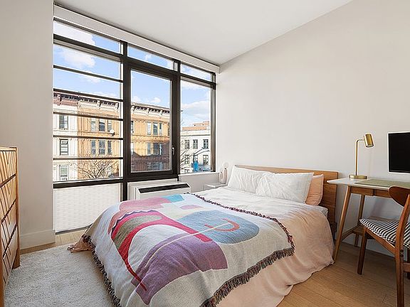 Welcome to this exquisite 1-bedroom residence nestled in the coveted neighborhood of Clinton Hill. This beautiful apartment, showcases an abundance of natural light through its six oversized windows, complemented by lofty 9-foot ceilings and a generously proportioned living space meticulously crafted to optimize every square inch. The kitchen, adorned with European wood and white lacquer cabinetry, boasts top-of-the-line Bosch and Liebherr appliances seamlessly integrated behind invisible reveal panels. Honed quartz countertops and backsplash exude a sense of opulence, while the counter-height island seamlessly transitions into the expansive living room, fostering an airy, loft-like ambiance. Expansive northern and western exposures afford picturesque vistas of the vibrant facades lining Fulton Street and the tranquil courtyards of neighboring Clinton Street buildings, lending a timeless charm to the 1930s-inspired architecture. The 13.5-foot-wide living room provides ample space for relaxation, dining, and a dedicated home office area. Additional features include an in-unit washer/dryer, custom LUTRON electronic solar shades on all windows and the transfer of 2 storage units with the sale. A 25-year tax abatement initiated in 2017.