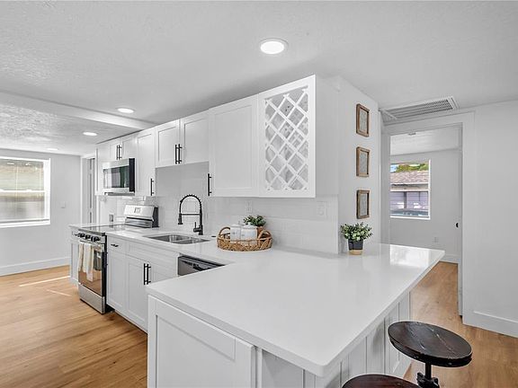 One or more photo(s) has been virtually staged. Beautifully renovated home under 300k in a quiet and established area of North St Pete. This three bedroom, one bath home offers peace of mind with a new roof and new HVAC from 2024. The kitchen features new appliances and a built in wine rack. The fully fenced backyard includes an above ground pool, perfect for warm Florida days, and the detached one car garage offers great flex space for a mancave, home gym, or workshop. Conveniently located near shopping along 66th Street, close to Tyrone Square Mall, and just a short drive to St Pete Beach and Madeira Beach, as well as local attractions like the St Pete Pier and Sunken Gardens.