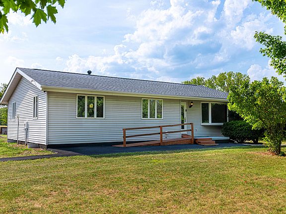 Wow! Situated on 2 country acres is this one level ranch w/ full finished basement! Refinished hardwood floors, updated kitchen w/ plenty of cabinet/countertop space, 4 season room to enjoy your views! Handicap accessible features. Primary bedroom is large & has full bath & laundry rm. Lower level is finished w/ living area, full kitchen, bedroom w/ egress window, flex room, and full bath. Perfect for in-law suite. Outside is the hobbyist dream! 64x36 insulated outbuilding has propane heat & hot/cold water! Dual Garage doors. Perfect for any hobby or extra storage. Detached 2 car garage with propane heat. Storage shed & carport. 50 amp outside connection for your RV. New Anderson windows, new roof w/ transferable warranty, new blacktop drive, fresh paint, & much more! Great location!