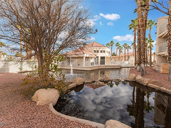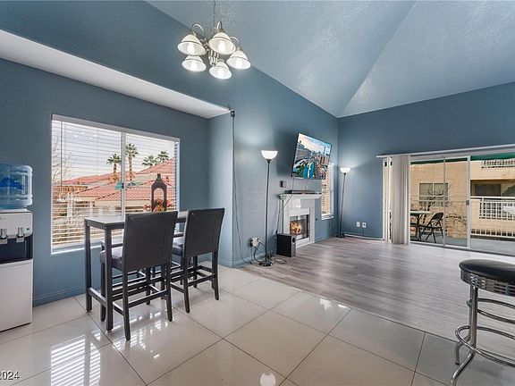 Welcome home to this exquisite 3-bedroom 2-bathroom condominium, nestled within a gated community just minutes from the vibrant Las Vegas Strip! This open floor plan offers a spacious living room with vaulted ceilings, cozy fireplace and a balcony that overlooks the community water features. Upgraded flooring throughout, including sleek tile and vinyl laminate wood flooring. The kitchen boasts quartz countertops, brand-new cabinets, and a breakfast bar. Master bedroom has substantial space and a private bathroom equipped with a tub/shower combo. Two bedrooms are equally roomy and located next to a full bathroom. Community amenities promise