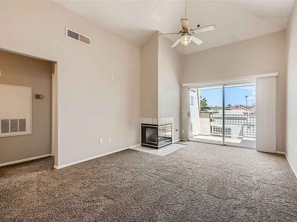 Beautiful condo located in the gated Laguna Del Rey community near the Las Vegas Strip. This one-bedroom, one-bath home offers an open floor plan with vaulted ceilings, a gas fireplace, and brand new carpet. The kitchen includes all major appliances, a breakfast bar, and plenty of cabinet and counter space. The primary bedroom features a walk-in closet and ample wall space. The full bathroom includes a garden tub and shower combination. A stackable washer and dryer are conveniently located in a separate area. Enjoy relaxing on the private balcony with views of the community water features. Residents also have access to the community pool and spa.