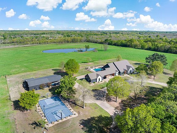 The home, pool, clubhouse, and sports court sit on 3 acres of beautifully maintained lawn, surrounded by open pasture, barns, and a 1.5-acre stocked pond and floodable duck slough for hunting.