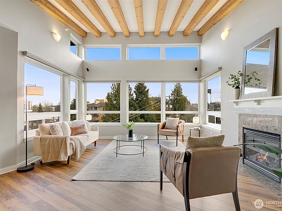 Coveted penthouse in the Adelaide with open, airy great room has beautiful vaulted ceilings with exposed wood beams. Serene sound views from private the primary bedroom deck. Luxury vinyl plank flooring in main living areas and new carpet in bedrooms. Freshly painted interior, California closets, blackout blinds and newer appliances. Gas fireplace, newer windows, new washer/dryer, and new bathroom shower door. Two side-by-side garage parking spots with bike storage, and two separate storage units. Rooftop deck with panoramic sound and mountain views, community room with little library, fitness room, sauna, and courtyard. Blocks from the heart of Alaska Junction’s shops, restaurants, and Sunday market and easy drive to Alki Beach & downtown.