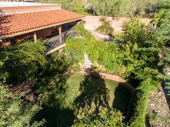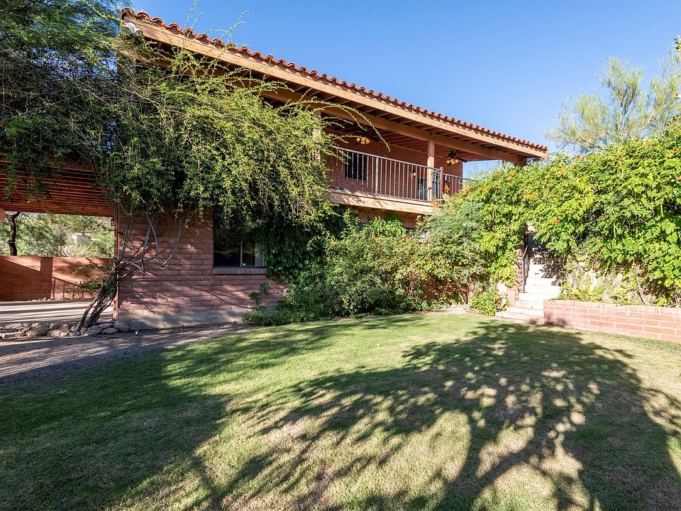 Buyers MUST see this unique home in the Foothills! Updated Kitchen with granite counters and travertine floor. Spacious Living Room is rustic but elegant with a wood-planked ceiling surrounding huge rough-sawn beams, hickory floors, a wood-burning fireplace and mountain views. A tiled backyard Veranda sits above lush landscape with many colored blooms and citrus trees. All Bedrooms are downstairs for cooler summer night sleeping and the Master Suite is spacious and serene with its own sitting area. A wonderful home on a private lot by a wash. A home warranty plan up to $450 will be provided at no cost to Buyers. Seller is Owner/Agent. Assessor records do not reflect an addition to the Master Bedroom Suite built prior to 2002.