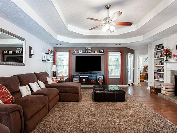 Stone fireplaceCraft roomRv carportCustom dark cherry cabinetsSeparate dining roomUncovered patioSs appliances